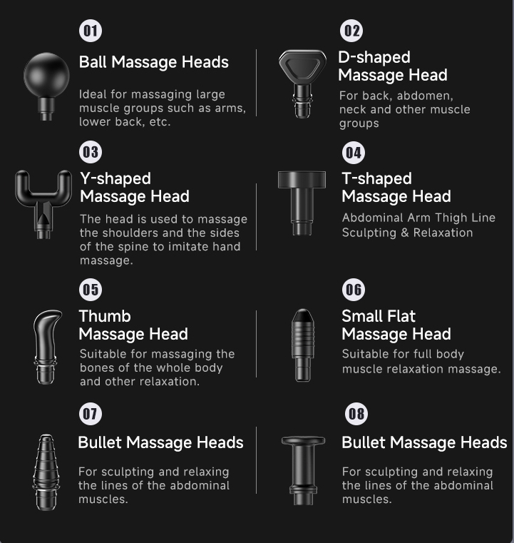 - 8 professional massage heads: Our deep tissue muscle massage gun is a black technology in the massage industry Strictly adhere to the theory of endurance compression of body muscles and bones, carefully take care of each muscle group. Based on the stress characteristics of the body muscles, provide 8 matching soft massage heads for different parts, and replace them according to your own needs For shoulders Back Neck Legs Waist Heels, etc. Provide a high-end storage bag as a gift.